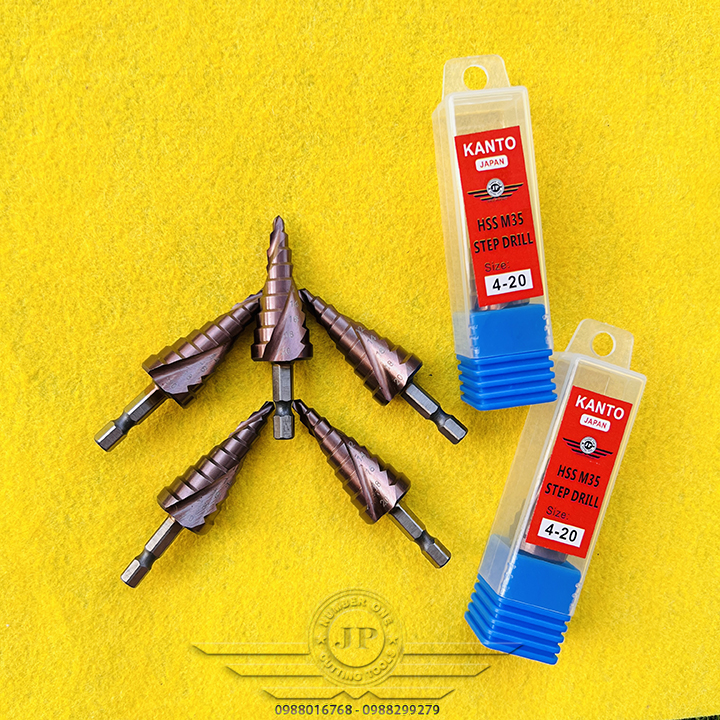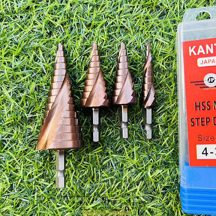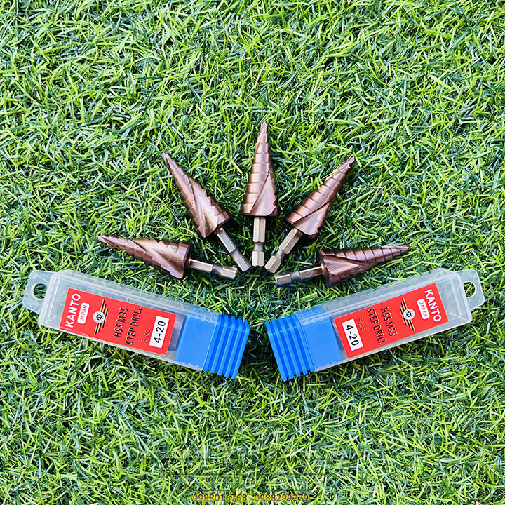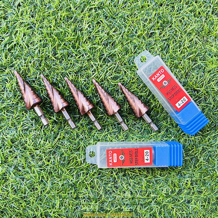 👉 Mũi khoan hình tháp dùng để tạo lỗ tròn đều trên các vật liệu mỏng hơn 6mm bằng cách khoan dần từ bước đường kính 4mm, khi khoan hết đường kính bé, bề mặt sẽ tiếp xúc với cạnh cắt của mũi khoan bước để chuyển lên bước với đường kính tiếp theo. Với một mũi khoan bước có thể thay thế cho rất nhiều mũi kích thước từ bé đến lớn, cụ thể, trong bộ mũi khoan bước này có 9 bước đường kính khác nhau từ 4mm đến 20mm