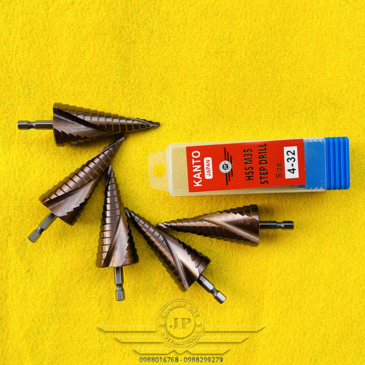 👉 Mũi khoan hình tháp dùng để tạo lỗ tròn đều trên các vật liệu mỏng hơn 6mm bằng cách khoan dần từ bước đường kính 4mm, khi khoan hết đường kính bé, bề mặt sẽ tiếp xúc với cạnh cắt của mũi khoan bước để chuyển lên bước với đường kính tiếp theo. Với một mũi khoan bước có thể thay thế cho rất nhiều mũi kích thước từ bé đến lớn, cụ thể, trong bộ mũi khoan bước này có 15 bước đường kính khác nhau từ 4mm đến 32mm