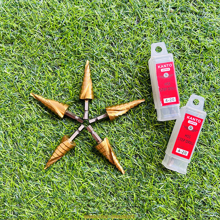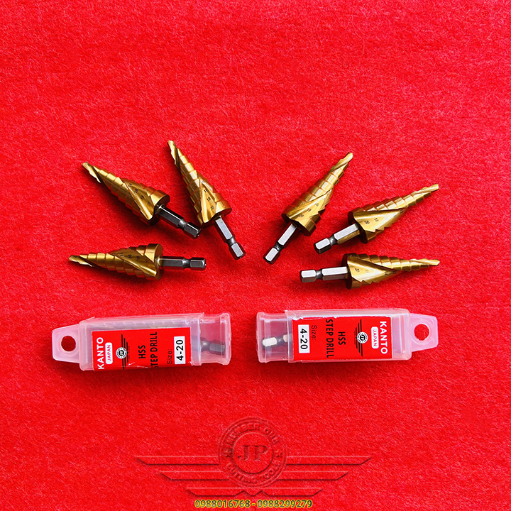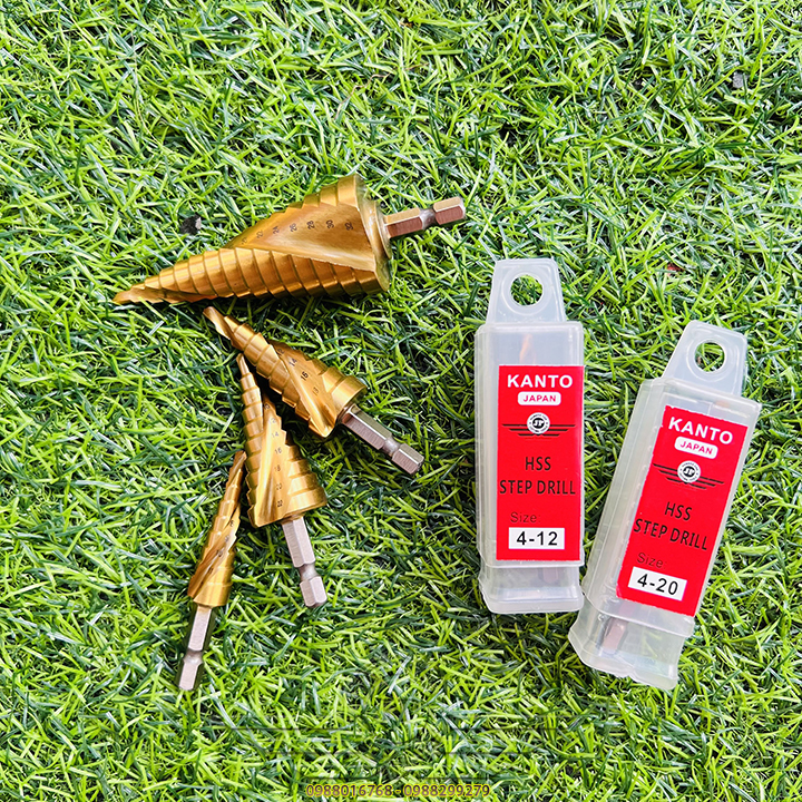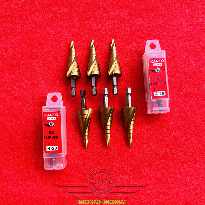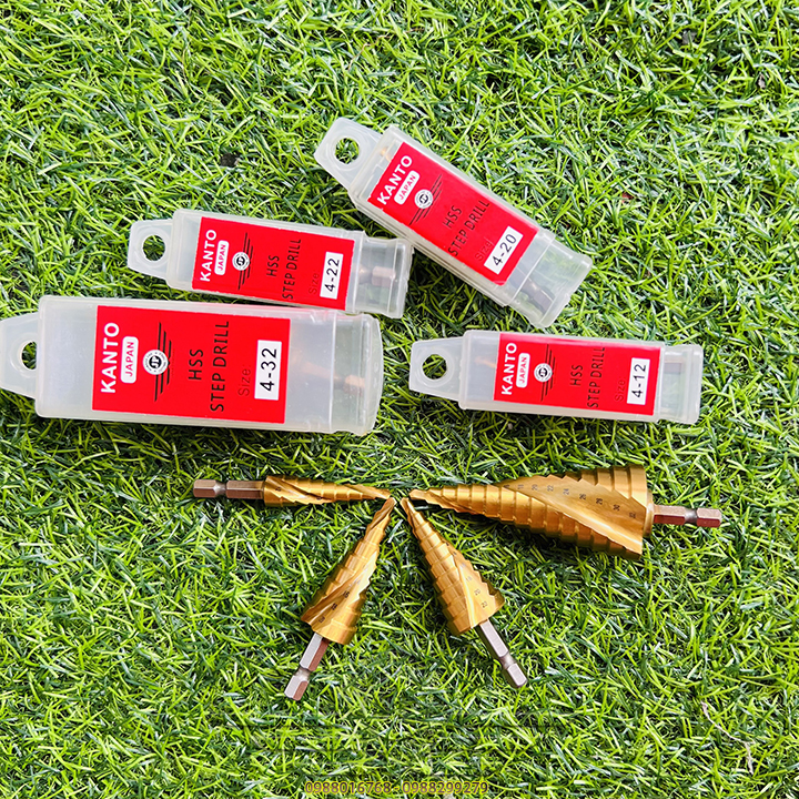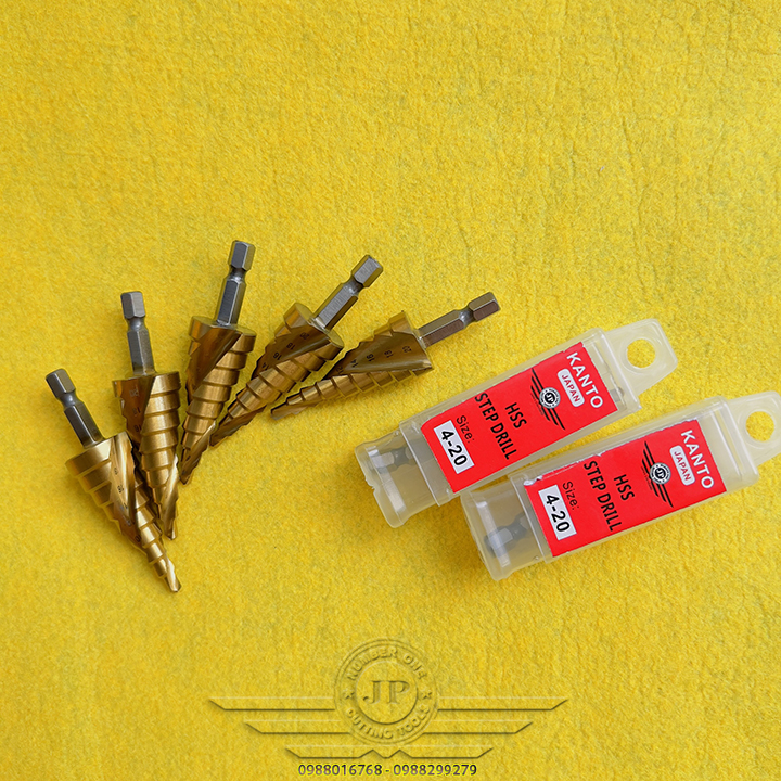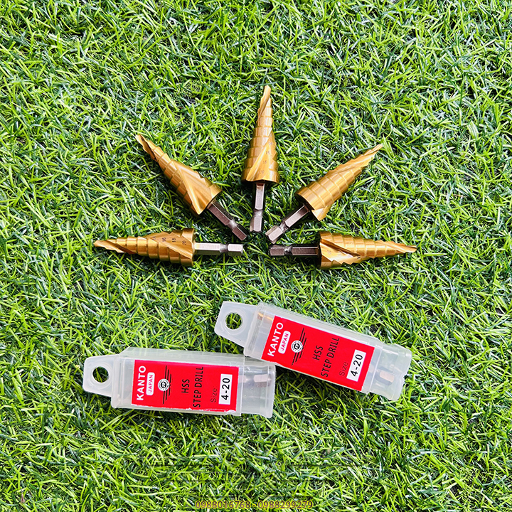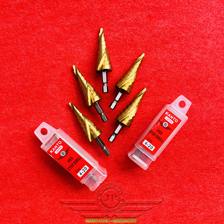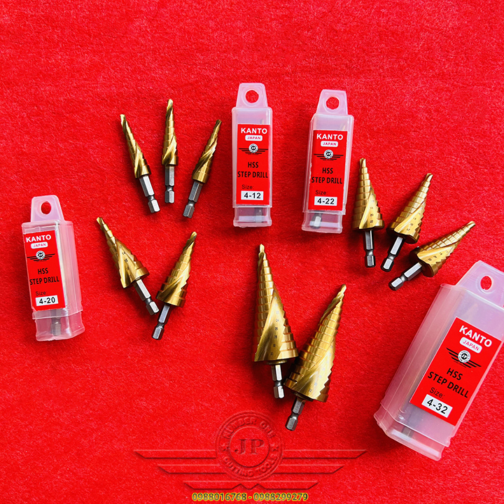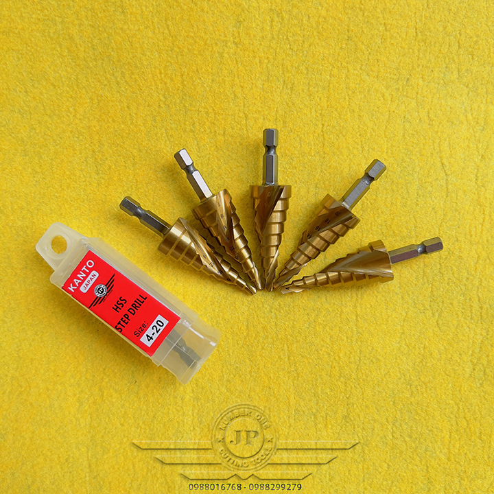 👉 Mũi khoan hình tháp dùng để tạo lỗ tròn đều trên các vật liệu mỏng hơn 6mm bằng cách khoan dần từ bước đường kính 4mm, khi khoan hết đường kính bé, bề mặt sẽ tiếp xúc với cạnh cắt của mũi khoan bước để chuyển lên bước với đường kính tiếp theo. Với một mũi khoan bước có thể thay thế cho rất nhiều mũi kích thước từ bé đến lớn.