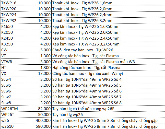 🌻 Tham khảo thêm các phụ kiện khác của súng hàn tig WP26 theo bảng giá dưới đây: